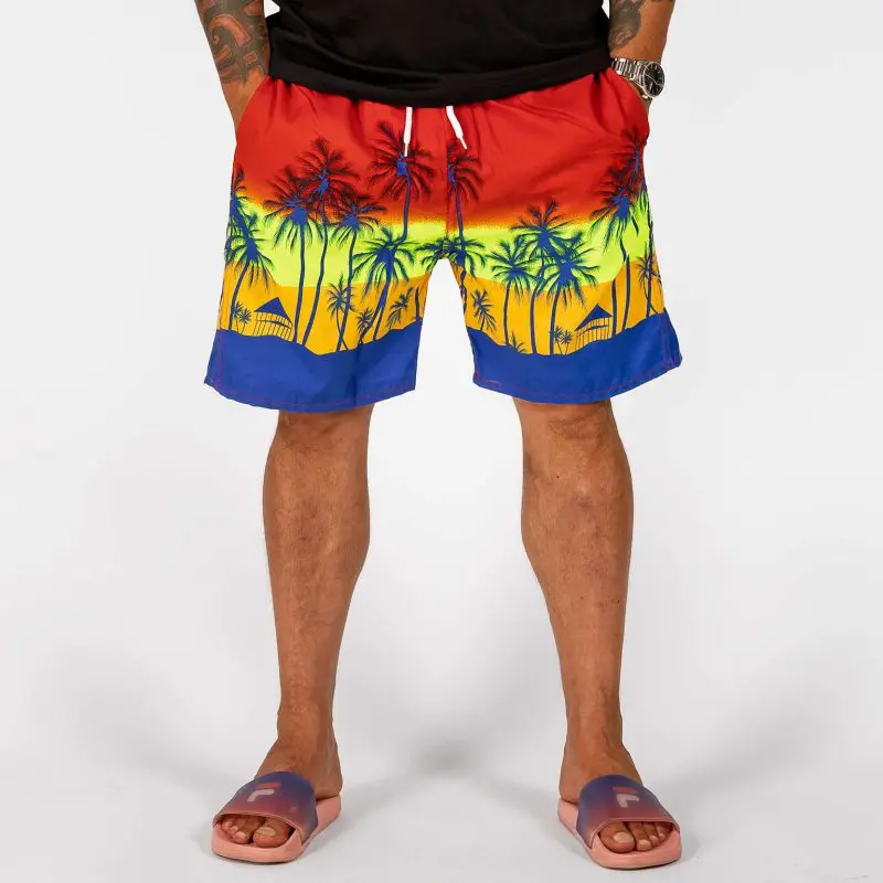 GAZOZ Surf Shorts – kevyet miesten rantashortsit punaisella palmukuosilla. Näyttävä ja mukava valinta rantalomalle tai kesäpäivään.